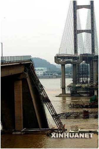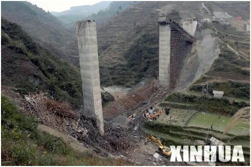 事故原因:支架问题。小尖山大桥位于开阳县南江乡龙广村村后的两座大山之间,全长155米,桥墩高47米。2005年12月14日5时30分左右,小尖山大桥突然发生支架垮塌,横跨在3个桥墩上的两段正在浇筑的桥面轰然坠下,桥面上施工的工人也同时飞落谷中。事故共造成8人死亡、12人受伤这起事故发生的原因主要是支架搭设时基础施工不符合相关规范要求,部分支架钢管壁厚不够,部分支架主管与枕木之间缺垫板。
