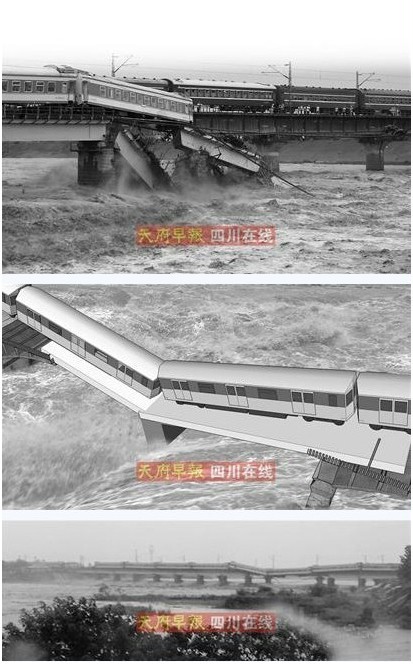事故原因:洪水冲击。2010年8月19日下午3时10分,从绵竹什邡顺石亭江而下的洪水在冲毁广汉段石亭江宝成线大桥东南侧的河堤后,大桥中段两根桥墩相继倾斜、倒塌。正在跨桥的西安至昆明K165次列车陡然脱轨,15号、16号车厢猛地下沉并成“V”字形。列车司机紧急停车,附近正在填堤的民兵、民警、村民、中铁抢险队员纷纷冲向大桥,展开生死大救援。30分钟后,1300名旅客安全撤离。