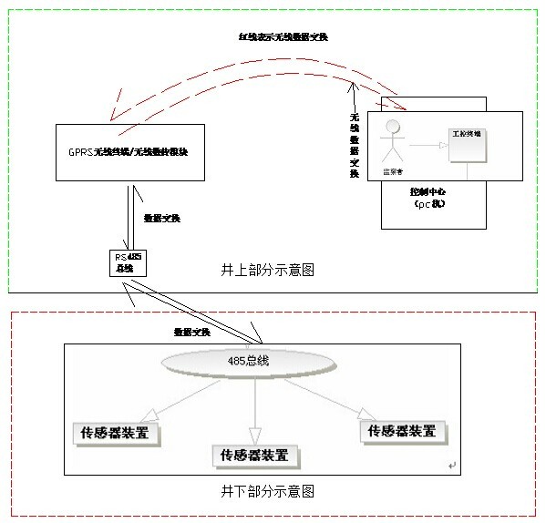 井上设有监察者和工控机,通过485总线控制井下测量段的传感装置。监察者通过控制工控机设置工作模式,全自动定时发送信号给传感器,传感器返回当前巷道进度。工控机将带地址的数据保存起来。监察者通过工控机查看井下隧道施工进度。显示方式可以直接数据显示,也可以通过图表显示。内容形式可以查看单个隧道在某个时间段里深度变化,从而判断施工进展速度,什么时间段里施工较快,什么时间段里施工慢(有图表和直接数据两种查看方式);还可以查看当前时间段各隧道深度,深度的大小明示了各隧道施工进度,这样有利于安排工作计划。