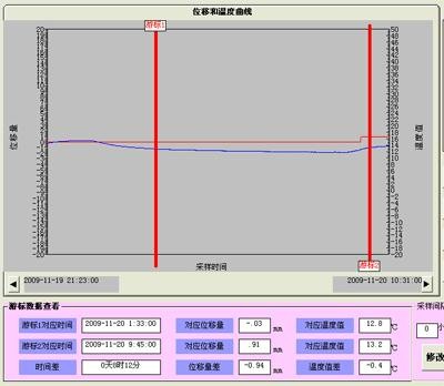 下载的数据使用随仪器提供的处理软件分析后,电脑上自动绘出该段时间内的裂缝宽度变化以及温度变化曲线。